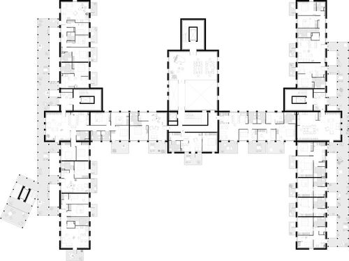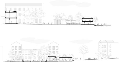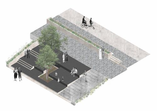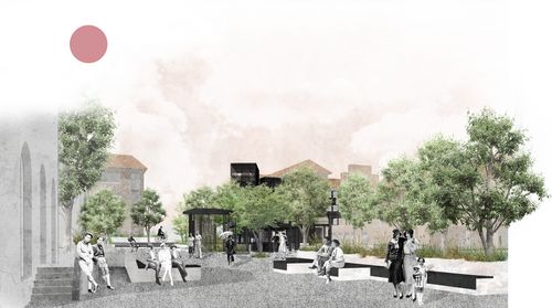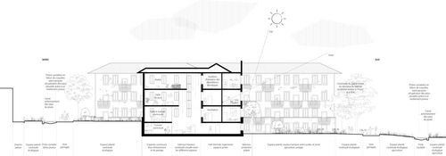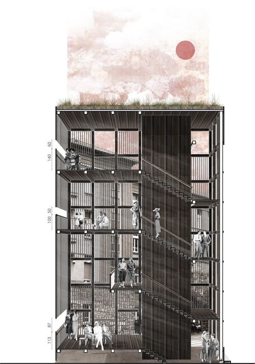 Dans un premier temps, nous nous sommes appuyées sur les ressentis de notre première visite : une impression de site enclavé, bien que comportant de nombreux espaces extérieurs, avec un fort dénivelé et avec une certaine autonomie. Nous avons voulu garder cette autonomie dans notre programme, tout en ayant pour objectif urbain l'ouverture du projet au reste du territoire, tant par les accès que par la mise en valeur des mobilités douces. La marche devenant ainsi un thème principal dans notre conception, nous avons effectué un travail de relevés sur tous les escaliers extérieurs de la parcelle, dus à la pente existante, dans l'optique de fluidifier au maximum les déplacements piétons. Nous avons étendu notre travail sur les espaces extérieurs en général, d'une place publique à des potagers communautaires, dans le but de créer des lieux incitant les rencontres et interactions sociales. De cet aspect public du projet, notre travail se prolonge graduellement vers le privé et l'intime, par la conception d'appartements au sein de bâtiments existants. Ces logements, incluant des appartements classiques mais également en cohabitation, ont été conçus et articulés de manière à promouvoir le partage et la vie en communauté, grâce notamment à l'insertion d'espaces communs intérieurs mais également extérieurs. Nous nous sommes appuyées sur des références comme l'ensemble de logements de Kraftwerk en Suisse, qui met en valeur un mode de vie coopératif et durable.
