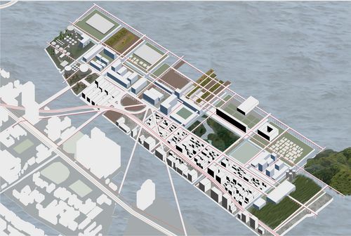 De manière à ré-intégrer le terre-plein, placé dans la continuité Est de la gare de Shinagawa, le projet urbain, par un travail en scénario, a cherché à accepter tous les possibles et à insuffler la diversité urbaine tokyoïte à cet espace : campus universitaire, quartier d'habitation très dense, espaces verts, équipements sportifs, logistique... Et une gare maritime.