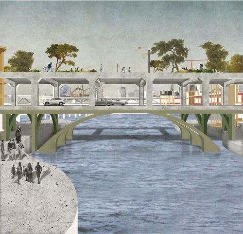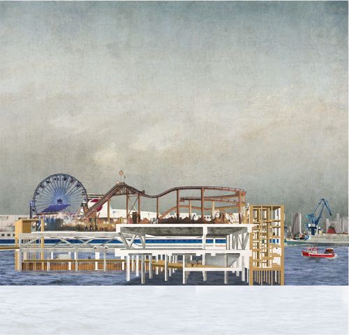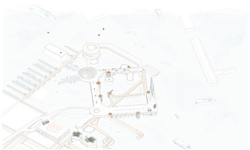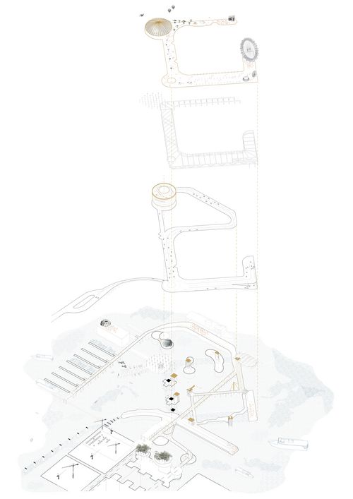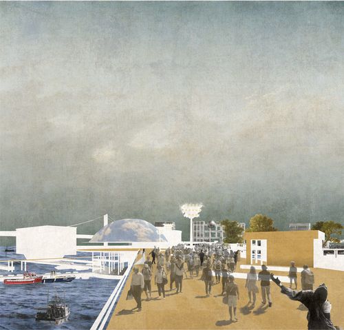 Axonométrie urbaine : Transformer un terre-plein artificiel en lieu de tous les scénarios afin de redonner cet espace aux habitants comme aux voyageurs. Créer une forme d'hétérotopie urbain au bord de la baie de Tokyo