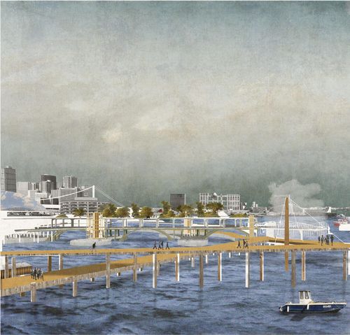 Axonométrie éclatée : Une superposition de strate, où viennent s'intégrer des plateaux libres entre et sur des niveaux d'accès logistiques entre bateaux, automobiles, piétons et cyclistes.