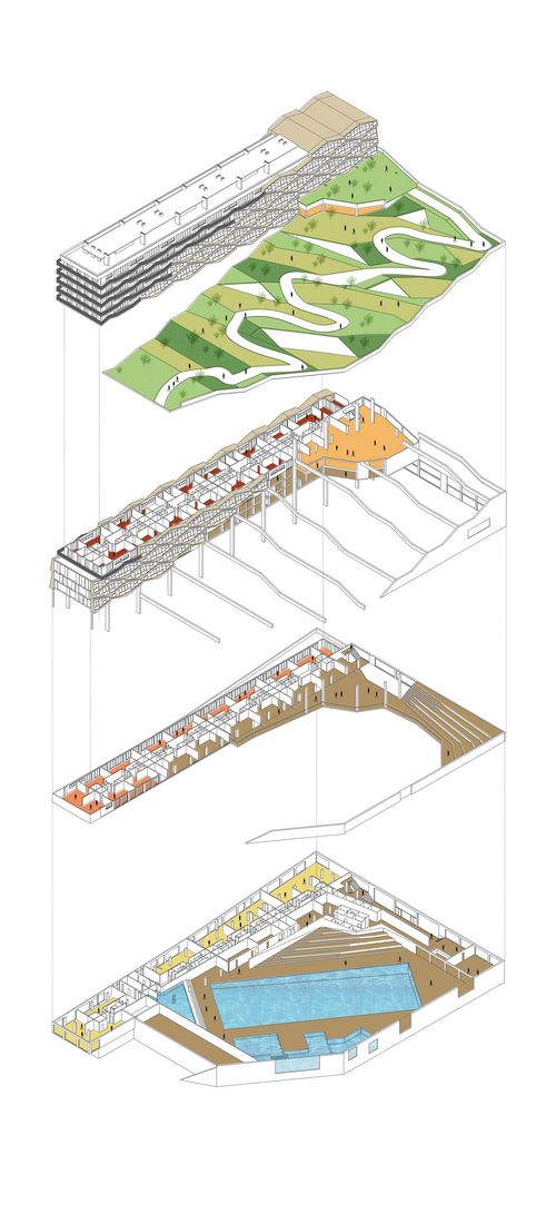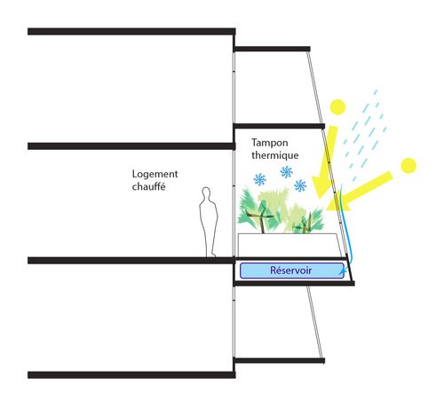 La rénovation des façades s'appuie sur les méthodes de conception du Bio-mimétisme en s'inspirant de la peau du lézard à flanc maculé (Uta Stansburiana) et ses technique de thermorégulation. Grâce à l'orientation de son corps et de ses écailles par rapport au soleil, il peut générer un taux d'ombre plus ou moins important sur la surface de son corps. Nous avons imaginé des jardins d'hiver qui, grâce à leur forme, créent d'autant plus d'ombre que le soleil est haut, prévenant ainsi les surchauffes. Combinant à la fois thermorégulation et récupération d'eau les modules donnent aux habitants des espaces semi-extérieurs appropriables et accueillants trois fonctions : rangements, assises et potagers.