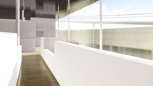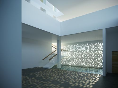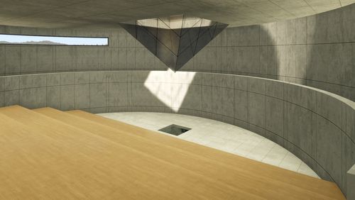 Quand on entre dans le bâtiment, on entre dans un autre monde. C’est un monde un peu sombre, éclairé juste par des lumières indirectes. Tout d’abord, au premier plan, on voit un escalier qui conduit au premier étage. Au dernier plan, on voit un peu de ciel et un peu de bâtiment. On sort dans l’espace d’accueil, on voit un grand espace avec une fenêtre, on s’approche, on continue, on voit deux fenêtres sur les deux côtés, vers la fenêtre à droite, il y a une vue traversante vers l’extérieur, on continue, on voit un autre espace avec une fenêtre, on avance, on arrive à un espace avec un mur perforé. Un bassin se trouve là-bas, il reflète la lumière entrée par les trous. Le couloir est éclairé par la lumière qui entre par la vitre du premier étage, pour guider le parcours. Ensuite on arrive à un espace près de la terrasse, qui est plus lumineux. On voit la salle de méditation au loin, au bout de la passerelle. On continue le parcours, et on arrive dans le hall.