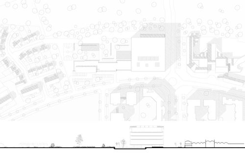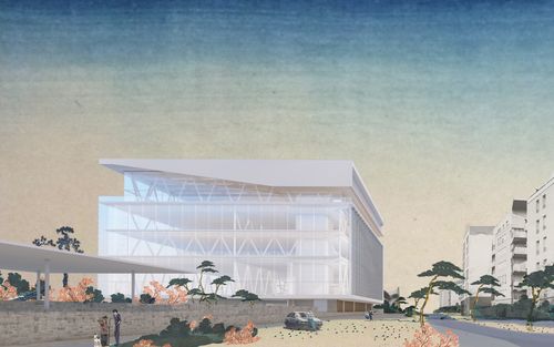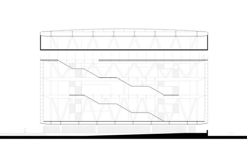Un grand équipement sportif pour un quartier de ville nouvelle, sorti de terre en moins d’un demi-siècle. Des plateaux qui s’empilent là où d’habitude les constructions s’étalent. Une maison des sports qui soit un signal, un lanterneau marquant le bord de la ville. En prenant le parti de la superposition des surfaces capables, se libère un « à côté », un jardin pour cette maison, afin de créer un temps de pause pour le citadin. Qu’il vienne emplir ses poumons d’un air qui n’est plus tout à fait celui de la ville, ses yeux d’une vue qui court au loin, des champs jusqu’à l’horizon. Une lanterne qui doit aussi s’articuler comme un pivot. Car si elle rayonne dans toutes les directions, par son plan carré, elle doit s’animer en son sein de tout ce qui la côtoie aux abords. C’est le rôle de la mégastructure. Composée de poutre en treillis de la hauteur de chaque étage, elle les empile dans un quinconce, dessinant ainsi sur cette base carré, un escape partitionné dont l’orientation varie à chaque étage. Le dernier plateau quant à lui est libéré par une poutre qui court en son bord afin de porter la toiture.