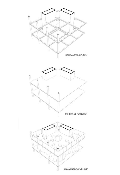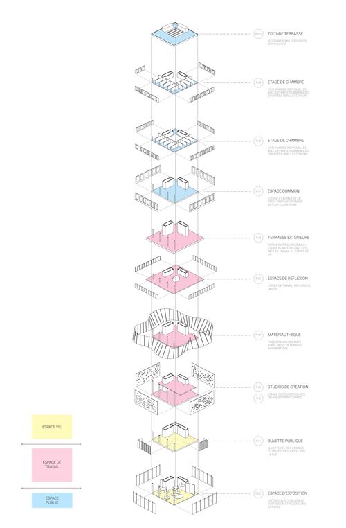 L’un des enjeux du projet fût de faire une proposition qui tienne compte de la mixité du programme (lieu de vie, de travail, d’échange) au sein d’un même bâtiment. Le parti prit est celui d’une superposition de parties distinctes, chacune correspondant aux différents éléments du programme. Chaque partie peut ainsi être traitée individuellement, compte tenu de l’usage envisagé, créer l’espace qui lui est le plus approprié et avoir son identité propre en jouant avec les hauteurs, vues, lumières, spatialités. Ce travail se caractérise particulièrement par une recherche d’équilibre entre unité et diversité.
