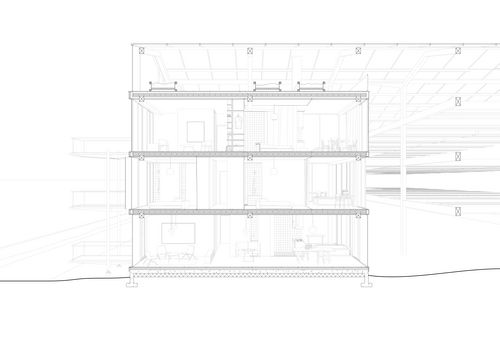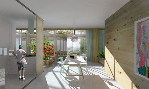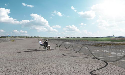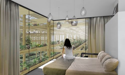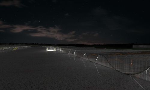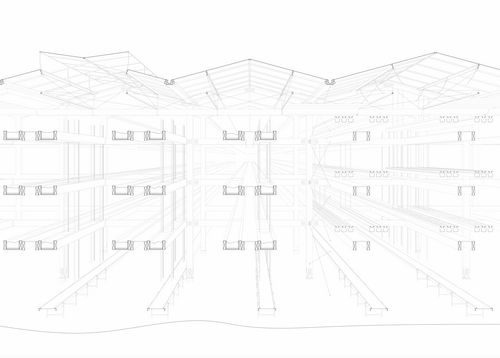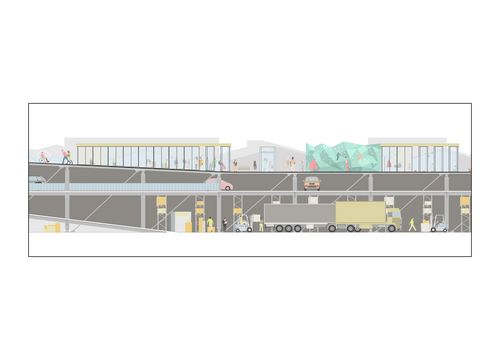 L’objectif est double : le sol naturel n’est pas imperméabilisé et son rendement est accru grâce à des bacs disposés dans une atmosphère protectrice. Le deuxième enjeu consiste à s’approprier le site. Aujourd’hui, ce terrain si particulier et si vaste est totalement inaccessible. Un espace public surélevé va créer une promenade traversant le site d’est en ouest, en ayant un impact minimum sur les parcelles cultivées. Ce pont regroupe plusieurs fonctions utilitaires et permet de à connecter les serres à l’autoroute et aux villes alentours et ainsi permet l’import et l’export de marchandises. Il permet aussi de desservir les logements intégrés dans le projet et fonctionnant en symbiose avec les serres. Ceux-ci dialoguent avec l’atmosphère de la serre et tirent parti de leur proximité avec cette nouvelle entité urbaine. La chaleur des serres peut servir aux logements et ainsi faire économiser à l’occupant une grande quantité d’énergie.