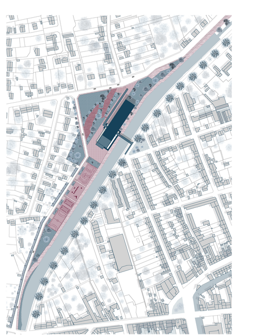 Aujourd'hui, la ville de Nemours ayant une fonction centrale sur son bassin de vie et constituant un potentiel de rayonnement et d'attractivité, elle bénéficie de ce programme qui a déjà donné naissance à certains aménagements. Ces villes moyennes représentent un capital historique, culturel inestimable, et cependant, nous assistons à la petite mort de ces cités de caractère. C'est dans une optique de sauvegarde que nous avons souhaité inscrire notre projet. Participer à notre échelle à la revalorisation d'un site, apporter notre pierre à l'édifice, cela répondait à notre envie d'être actrices pour la préservation d'un patrimoine en péril. C'est ainsi que nous avons créé une bande programmatique ludique et culturelle sur des berges abandonnées de la ville. Tous les aménagements que l'on propose s'inscrivent dans une démarche de prévention des inondations et de création de liens sociaux. A la frontière entre urbanisme, paysage et architecture, nous avons cherché à développer notre projet de manière sensible et cohérente.