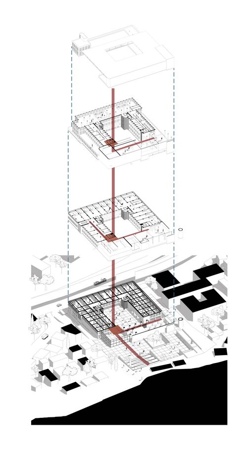 Axonometrie eclatée du projet indiquant le parcours dans le bâtiment