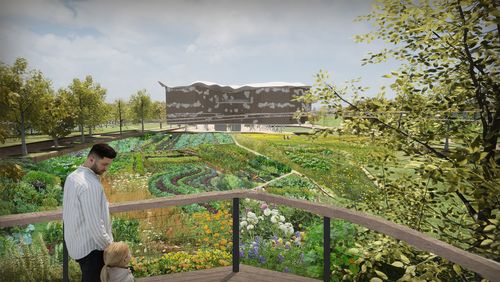 Vue perspective sur les parcelles en permaculture et la façade Nord du bâtiment.