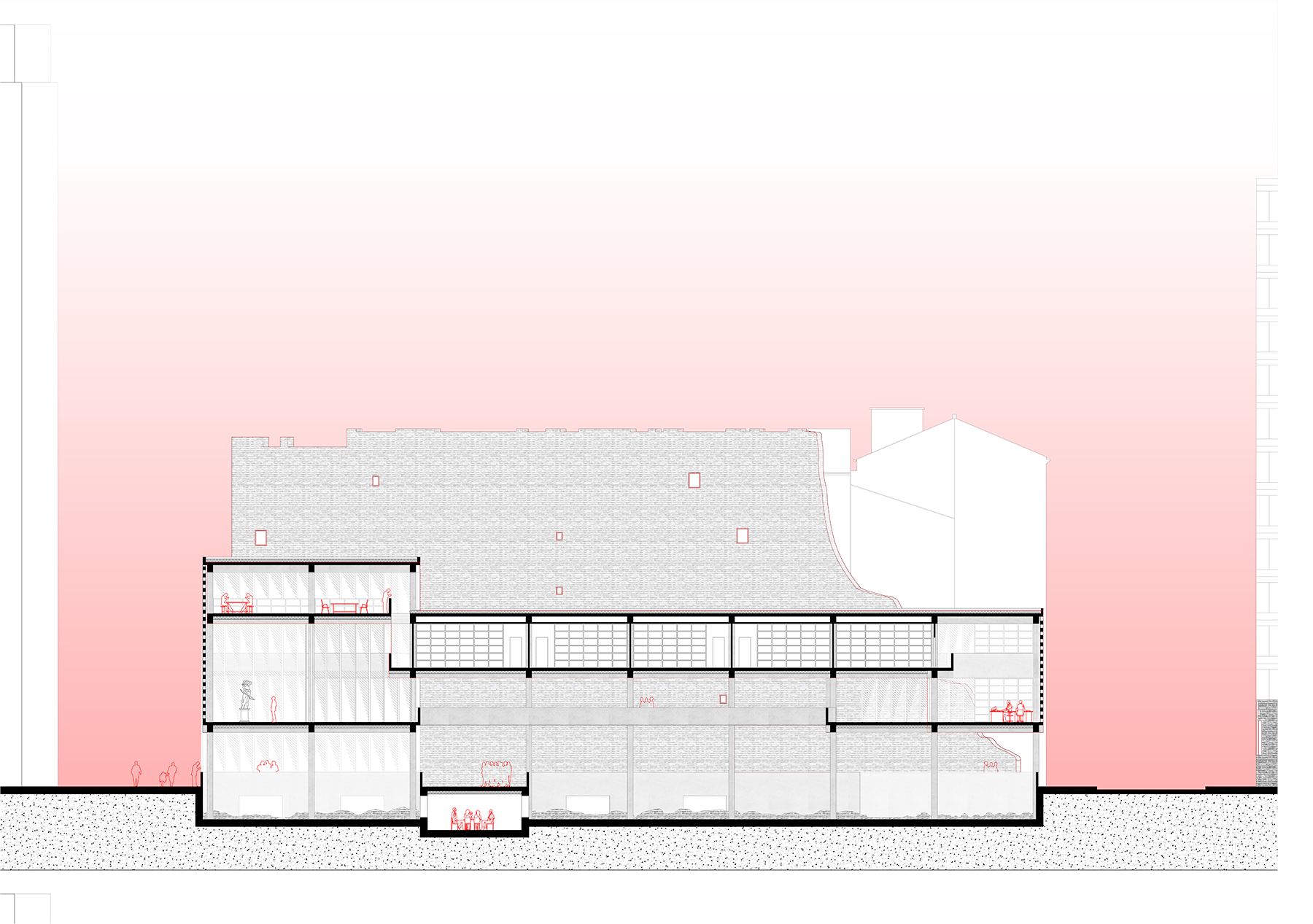 Afin de générer une mémoire vivante donc appropriable, le projet vient à la fois révéler les traces du passé identifiées comme signifiantes (fondations d'édifices détruits, fragments du mur du ghetto, etc.) et enrichir le lieu de nouveaux programmes. Ceux-ci se connectent symboliquement et formellement à l'existant. L'espace publique suspendu qui traverse tous les éléments du projet permet d'organiser une mise en récit du passé. Pensé comme dispositif scénographique, il crée la cohérence entre ces traces éparses.