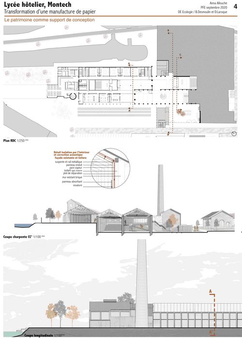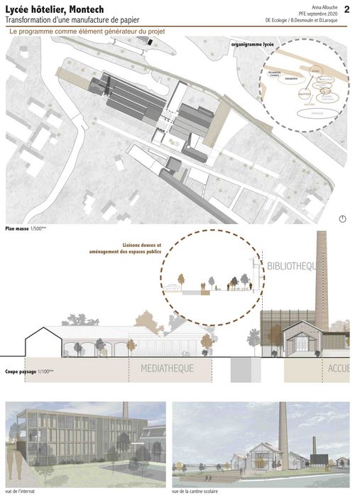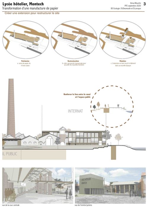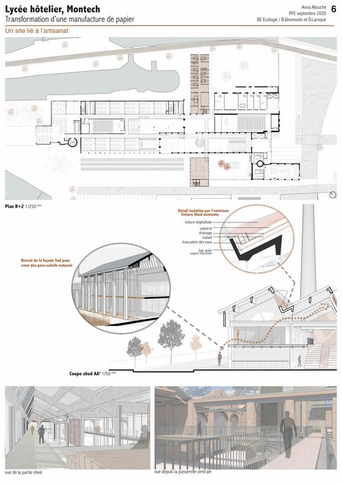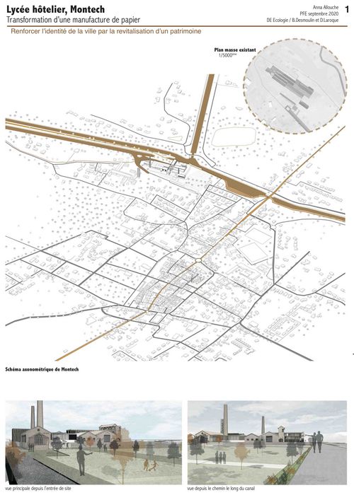 Mon projet de fin d'étude se situe dans le Bourg de Montech dans le Tarn-et-Garonne. C'est une ancienne manufacture de papier du milieu du XIXème siècle qui longe le canal latéral à la Garonne. Le bâtiment se remarque dans la ville par son architecture industrielle. Il est composé de deux parties dont une en charpente bois et une en structure shed et béton. Mon projet est d'en faire un lycée hôtelier, composé d'un pôle hébergement, enseignement, accueil public et accueil étudiant. Une percée centrale permet d'accueillir une extension ainsi que de redéfinir les fonctions du site. Le bâtiment se compose alors de 4 ailes. Les deux existantes accueillent le pôle public dans la partie charpente (restaurant d'application / administration / auditorium public) et le pôle enseignement dans la partie en shed (salles de cours pratiques et théoriques).