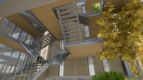 L'espace du coliving propose une offre de logements aux personnes traversant des périodes avec des durées flexibles. En d'autres termes, c'est une fusion d'un espace habité à des services et à une communauté dans une atmosphère conviviale et avec un esprit de collaboration. Ainsi, pouvoir profiter d'une installation rapide et clé en main, et mettre en place une interaction sociale, place conquise par son antonyme la solitude. L'enjeu du projet est de créer des lieux d'intimité, accessibles aux personnes en transition, au sein même des espaces de travail, de loisir, de partage, et ainsi maintenir une frontière entre la vie privée et la vie professionnelle au sein d'un même groupe, grâce à une mise en place d'une structure sociale organisée et hiérarchisée. Le projet tente de répondre à ces questionnements, auxquels s'ajoute le défi de s'inscrire dans une démarche de développement durable avec l'utilisation maximale de matériaux naturels, tel que le bois, la terre, et faire de la végétation un outil de conception pour un design durable, et de son importance pour la valorisation des espaces verts. C'est ainsi, que pour nous concepteurs, architectes et paysagistes, de l'architecture contemporaine, il nous est indispensable de faire preuve d'audace et de créativité pour des projets qui sauront satisfaire les différents piliers du développement durable.
