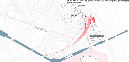 Au nord-est de Paris, plus précisément entre le canal et la voie ferrée, la rue d'Aubervilliers prolonge la rue du Château-Landon depuis le boulevard de la Villette (ancien mur des fermiers généraux) pour rejoindre l'avenue de Flandres, et de manière plus confidentielle la convergence du canal de l'Ourcq et du canal Saint-Denis. Le tracé accroche et met en liaison les équipements les plus importants du territoire : le canal, le parc de la Villette, la gare Rosa Parks, les grands parcs Éole et Chapelle Charbon. Il rassemble également de près ou de loin des gares parisiennes. Il délimite enfin un grand paysage exceptionnel dans l'espace urbain dense dans la métropole. Ainsi, structurée et structurante, ces dispositions esquissent les potentialités d'ordonnancement, de développement et d'armatures urbaines que ce grand tracé peut dessiner pour le territoire nord-est.