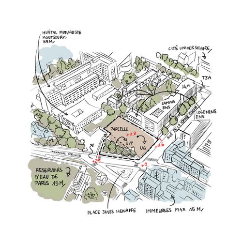 Le projet Hors-Normes se situe à Paris, au cœur de l'information, il est composé de cinq pôles spécialisés : un pôle de travail, un pôle de soutien familial, un pôle mixte, un pôle de soins et un pôle d'hébergements. L'objectif de ce centre est de favoriser le développement de l'indépendance de ses résidents à travers divers repères visuels : variation de façades et utilisation de couleurs et de matières différentes sur les murs et les sols. En ce sens, le projet utilise la courbe qui permet aux résidents de se positionner dans l'espace en passant de bi- à tri-dimension. Egalement, la présence du végétal permet quant à lui d'apaiser certains traits autistiques. Il est donc important dans un projet urbain.