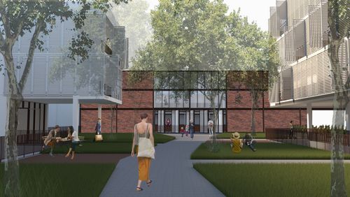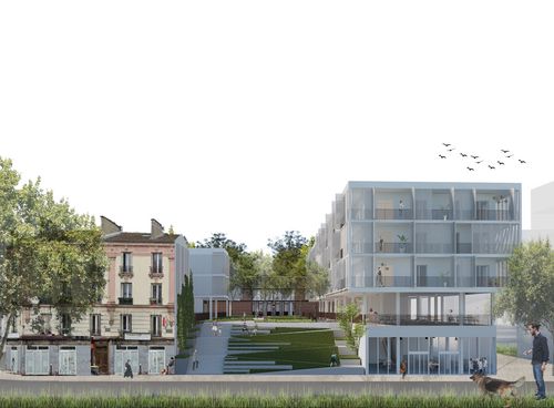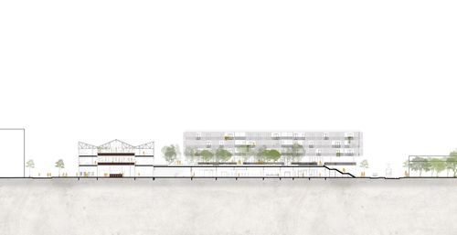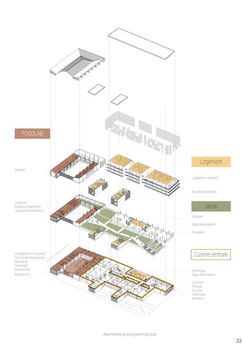 Le programme se compose de trois entités : une cuisine centrale, un Foodlab occupant la halle et deux typologies de logement (collectif et étudiant), l'ensemble est organisé autour d'un espace central végétalisé qui permet la création de perspectives mettant en avant le patrimoine et l'extension de l'espace public à l'intérieur de notre îlot.
