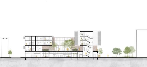 Un lien entre les entités programmatiques superposées est assuré par l'extension du jardin dans chacune de ces dernières sous différentes formes : des patios pour la cuisine centrale, le potager et la serre dans la halle et des terrasses partagées au niveau des logements.
