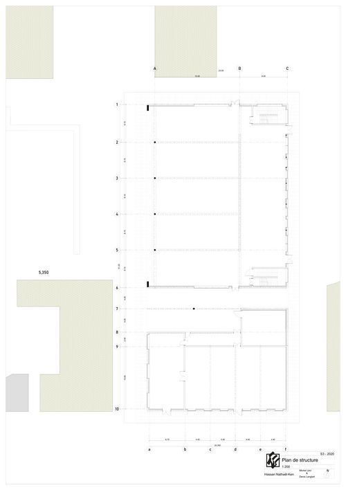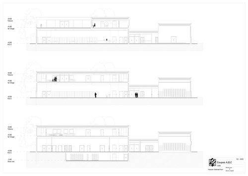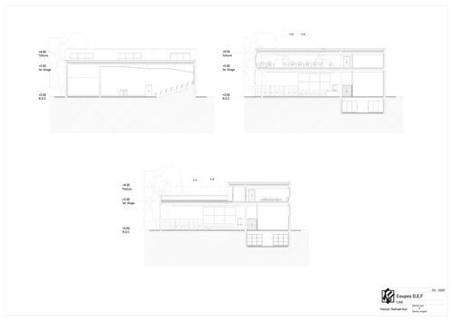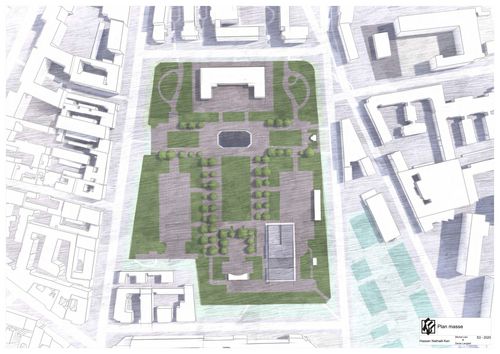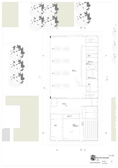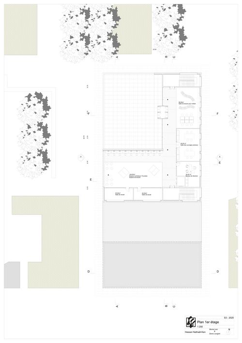 Situés au cœur du parc de Choisy, la bibliothèque et son amphithéâtre sont vecteurs d'échanges et de rencontres autour de la nature et de la préservation. Nous avons particulièrement étudié l'analyse du site et l'implantation du bâtiment dans son contexte en travaillant sur sa volumétrie mais aussi sur son enveloppe extérieure qui agit comme un filtre dans les paysages du parc. Il est question de proposer plus qu'un lieu de prêt et de consultations d'ouvrages. Le but de ce projet est d'offrir des ambiances et des vues, destinées à mettre le visiteur au centre du projet voire même d'une expérience personnelle. Le souhait de ce projet est qu'il devienne un véritable lieu de vie, tel qu'une grande place commune, dédiée à la culture autour de la nature et de la préservation à Paris. L'entrée, située dans le prolongement de l'axe principal de l'esplanade mémoriel du parc, est traitée par l'alignement d'un volume linéaire en béton qui résulte d'un travail sur la façade longitudinale du bâtiment. Elle permet d'ouvrir le rez-de-chaussée sur la place et le théâtre des guignols tout en attrapant la lumière naturelle.
