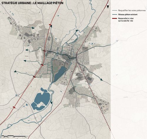 Notre stratégie territoriale réunifie la ville et les éléments remarquables par un maillage de liaisons douces et par l'eau.Thomas Sieverts : " donner aux habitants la conscience d'habiter une région urbaine formant un tout cohérent [pour développer une] nouvelle forme d'appartenance à un lieu qui renforce l'identité ".