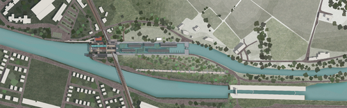 L'un des premiers choix a été de restituer le canal d'amenée en amont de l'ascenseur à bateaux afin de rétablir et de renforcer l'identité du site lié à l'eau. Ensuite, la composition du site étant marquée par une très forte linéarité résultant de la morphologie du canal d'amenée et de l'architecture de l'ascenseur, le choix de l'implantation des nouveaux édifices a été de respecter cette linéarité.