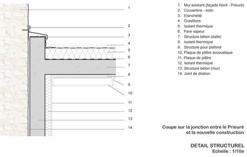 Ce projet est composé de trois phases interventions, tout d'abord une intervention de restauration des façades de l'édifice, marqué par de nombreuses évolutions dûes aux différentes activités. Une intervention urbaine permettant ainsi de requalifier l'espace public et ainsi d'établir un lien entre le parvis de l'Eglise et le parvis du Prieuré, et une intervention architecturale, avec la création de deux greffes sur les traces historiques des anciennes ailes du bâti.
