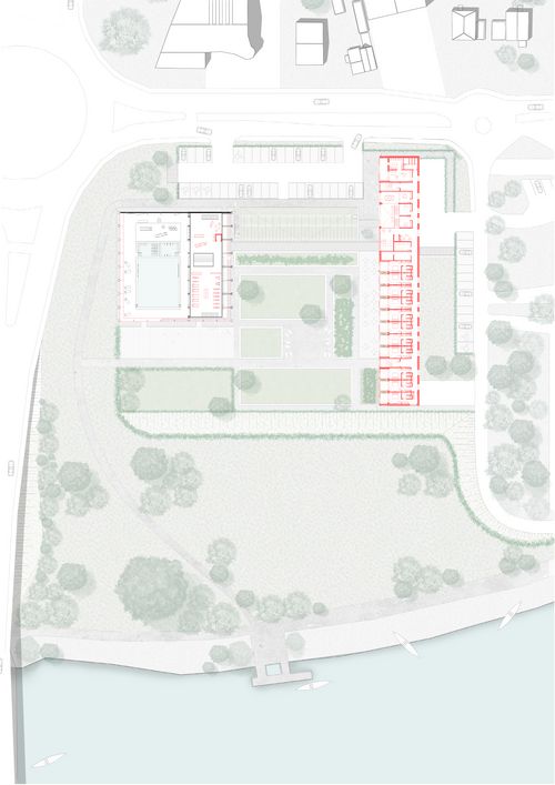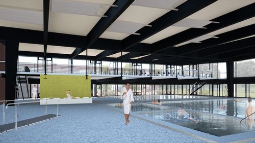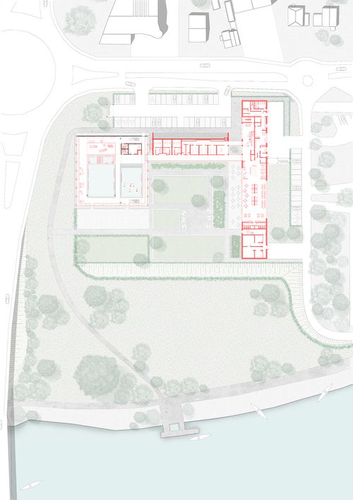 Le projet s'articule autour de la piscine recevant la partie soins du centre c'est-à-dire la balnéothérapie, l'ergothérapie et la remise en forme. A cela vient se greffer une extension monolithique en brique abritant les services du centre (accueil, restaurant, bar, chambres pour les patients, administration). La liaison entre ces deux bâtiments se fait par une galerie vitrée en partie sud et fermée au nord par un talus artificiel. On y retrouve les vestiaires, les douches ainsi que la partie kinésithérapie. Cette galerie s'ouvre sur le jardin intérieur ainsi que sur le paysage des bords de Marne. Le centre se veut être en dialogue avec cette nature et d'offrir des espaces de détente et de soin au milieu de celle-ci.