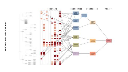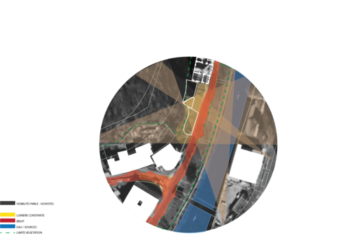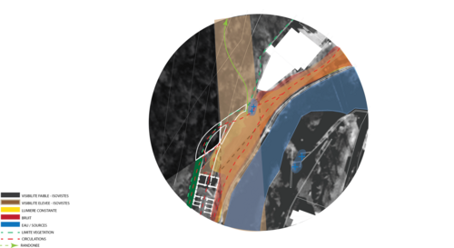 A partir de la matrice principale, lorsqu'on observe le territoire pour établir un diagnostic, nous pouvons superposer plusieurs types d'informations ce qui nous permet une meilleure lecture. La superposition des différentes cartes à différentes échelles nous permet de définir les potentiels d'affordance - des points/ zones clés sur lesquels se fonde la stratégie programmatique et le profilage architectural.
