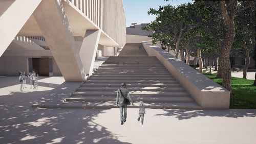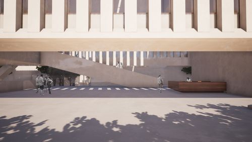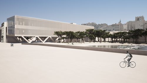 Un large édifice public termine la transformation du site. Il referme l'îlot éventré depuis la construction de l'échangeur, achève la façade du Vieux-Port et s'inscrit dans la continuité du mur Sainte-Catherine. Le long du bâtiment est crée un passage public en pas-d'âne à la manière des escaliers marseillais. Ce passage offre des vues nouvelles sur le site, dessert le bâtiment et relie de manière douce Saint-Victor dans la continuité de la pente de la colline. Comme aboutissement de ce parcours, un parvis est crée devant Saint-Victor. Grande surface plane, ce parvis contribue à poser l'abbaye.