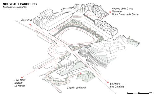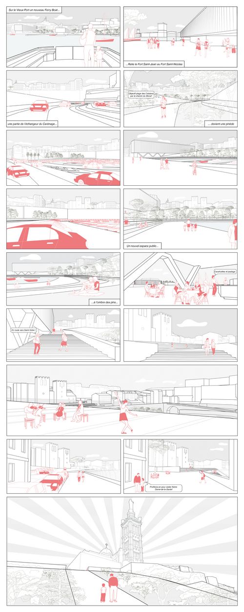Dans une logique d'économie de la mesure, l'infrastructure existante est conservée. Un amphithéâtre planté de pins suit les tracés de l'échangeur autour du bassin, les lignes de la voirie deviennent des courbes de niveau. L'arrivée d'un Ferry-Boat sur le Quai Marcel Pagnol amorce le récit d'un parcours possible du Fort Saint-Jean à l'abbaye Saint-Victor, début de l'ascension de la colline de Notre Dame de la Garde.