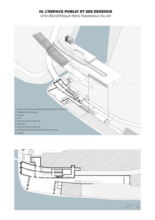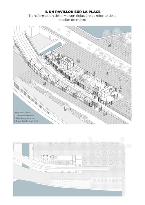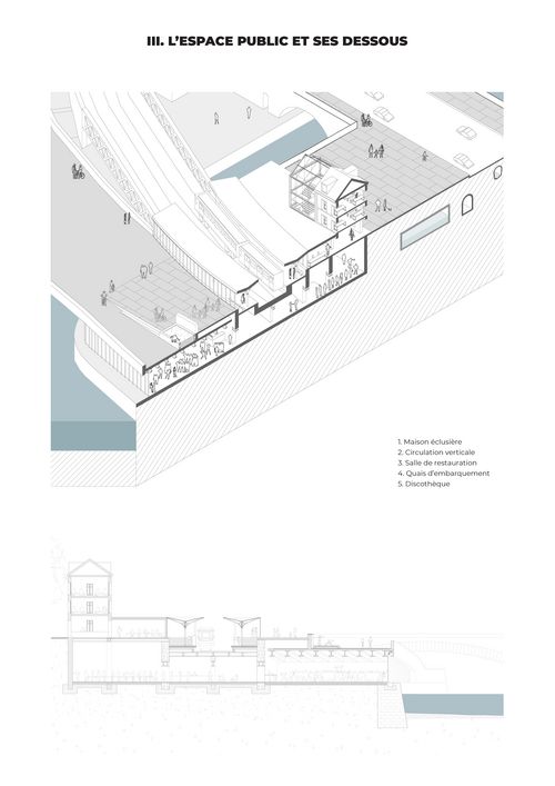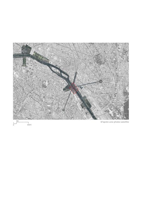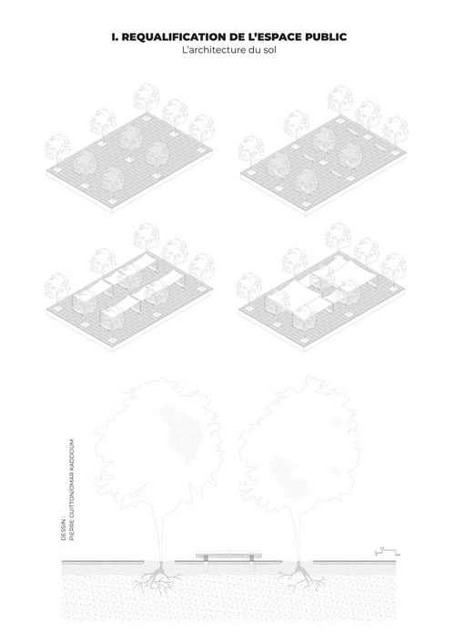 Ce Projet de Fin d'Études requestionne les enjeux urbains de cette place publique. Il vise à la réintégrer au large système urbain dans lequel elle s'inscrit en prenant en compte les différents éléments qui la composent. C'est un travail qui repose essentiellement sur la compréhension et l'utilisation de l'existant comme préalable au projet et la transformation du sol comme sujet architectural. Il s'agit de fabriquer une place publique qui tire profit de sa situation exceptionnelle tout en minimisant les coûts de travaux et en s'inscrivant dans une démarche de réemploi d'infrastructures et de revalorisation de l'héritage architectural à travers quatre grandes actions :