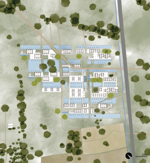 - la moitié du site est laissée vierge pour maintenir les cultures et densifier une partie du site (ombrage mutuel des bâtiments)