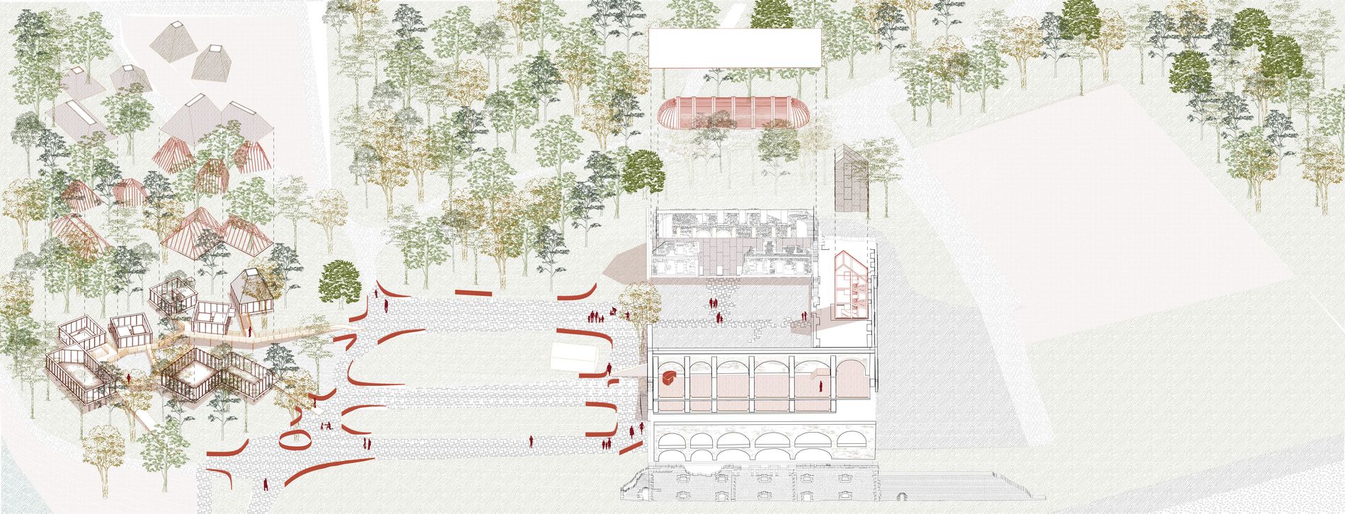 J'ai choisi de traiter tout le site de l'abbaye qui est constitué d'une terrasse d'herbe, de forêt, de vigne et de l'abbaye. Un traitement paysager vient guider les promeneurs, grâce un chemin de pierre calepinée de pierre de Bourgogne, et de garde-corps inspiré des murets qui terrasse les vignes. Ils viennent orienter les visiteurs vers les deux attractions du site que sont l'abbaye qui est un pôle de démonstration et de d'expérimentation de l'artisanat et une résidence pour artisan niché dans la forêt. Les deux interventions ont été effectuées en bois brûlés afin de contraster et de mettre en valeur les cicatrices de la ruine mais aussi d'utiliser une technique qui vient fixer le bois et permettre qu'il ne s'altère pas avec le temps.