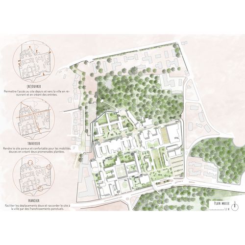 A la périphérie de la commune de Garches, l'hôpital Raymond Poincaré fera l'objet en 2025 d'une transformation suite aux déplacements des services hospitaliers à Boulogne-Billancourt. Les démarches de reconversion prennent alors en compte les édifices existants, une topographie particulière et l'intégration du site à la ville. Mon projet propose, à l'échelle urbaine, une réouverture à la ville du site enclavé, en offrant aux habitants un nouveau quartier à usages mixtes, sain et convivial, notamment par un travail paysager (promenades plantées, noues végétalisées...). Il s'agit en outre d'effacer les coupures vertes et urbaines afin de permettre au marcheur de parcourir son territoire sans discontinuité, et ainsi d'encourager les déplacements doux.