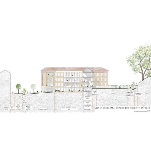 Coupe AA sur les espaces extérieurs et la bibliothèque spécialisée
