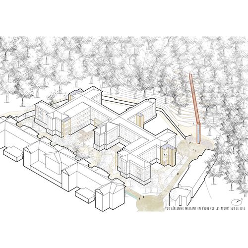 Mon projet se concentre sur le secteur Letulle qui est isolé et particulièrement enclavé par la présence d'un mur de 2,5 mètres de haut suivi d'un talus boisé. Au nord du bâtiment Letulle, différents moyens de franchissement tirent profit de la forte déclivité du terrain en travaillant avec la limite et sa pente et en les utilisant comme belvédère sur le site. Le projet architectural expérimente la transformation du bâtiment Letulle en un habitat partagé convivial ainsi que d'une bibliothèque. Une partie de celle-ci gardera la mémoire de la renommée mondiale de l'hôpital en chirurgie orthopédique. Ces transformations ont pour but commun d'encourager les liens intergénérationnels afin d'éviter l'isolement des personnes vivant seules ou l'exclusion des personnes âgées souvent regroupées entre elles.