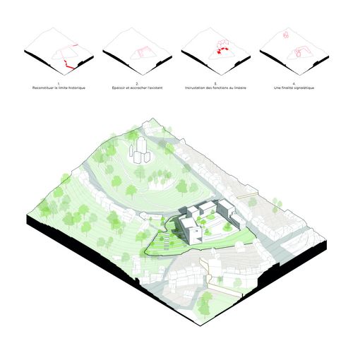 Se basant sur deux éléments de composition majeurs inhérents au site : le Rempart & le Belvédère, la promenade & le paysage, le projet se présente comme une étape dans un parcours de réflexion émis par l'essence de la ville. Une entité linéaire séquentielle, de déambulation didactique et sensorielle, visant à instiller la créativité et réassumer le Génie du Lieu de l'époque.