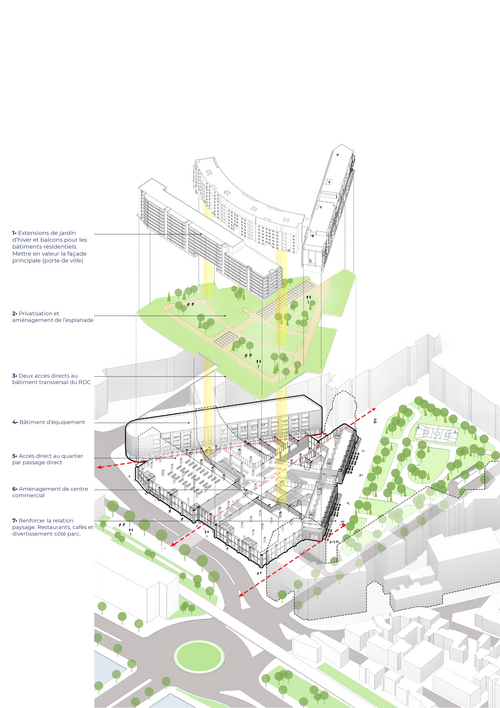 La seconde est de se concentrer sur l'échelle architecturale du quartier, comme l'aménagement du centre commercial, de remettre en valeur les bâtiments résidentiels et l'esplanade, qui résulte de ma réflexion initiale pour apporter des réponses aux problématiques soulevées et redonner une vitalité au quartier.