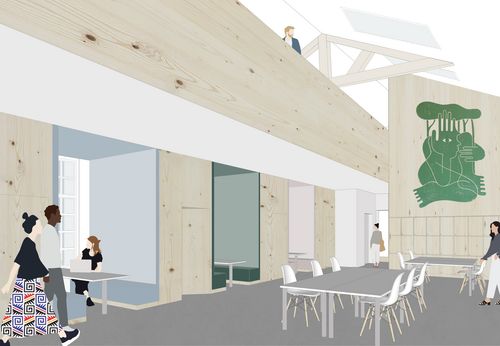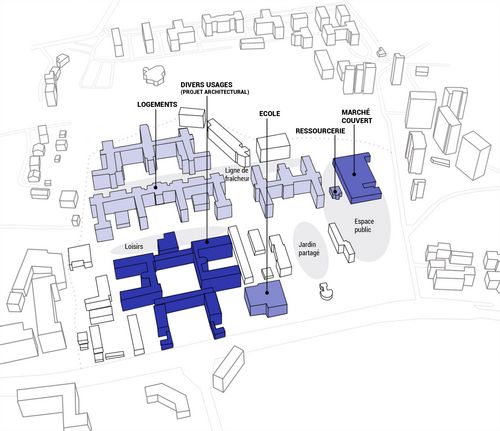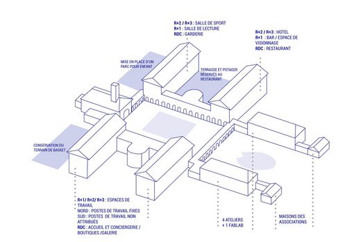 Le projet architectural se concentre sur le bâtiment inscrit aux monuments historiques : le bâtiment Brézin. Composé de six pavillons, il propose un programme mixte intégrant entre autres différents espaces de travail, ateliers d'artisans, restaurant, hôtellerie et garderie. Le bois est un élément essentiel du projet en se déclinant dans une variété de filtres pour différents usages. Il devient alors paroi mobile, meuble, bibliothèque ou encore cabinet de curiosités permettant ainsi d'unifier les différents espaces. Enfin, une attention particulière est portée sur le choix des matériaux utilisés, sourcés de façon locale et en favorisant la filière du réemploi.