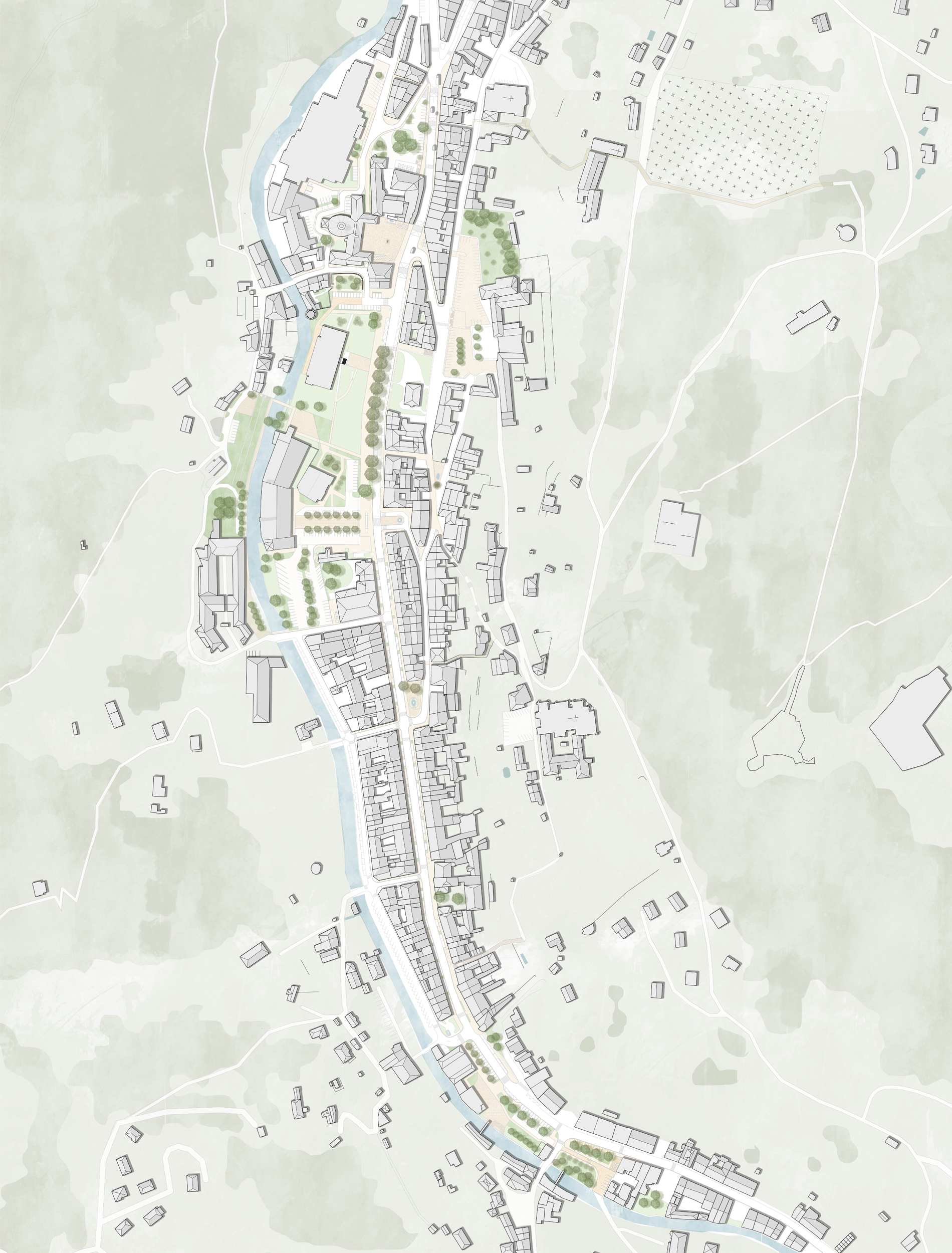 En créant un lien entre les places publiques existantes et le parcours touristique, le choix du périmètre d'intervention a été basé sur une continuité : des endroits clés liés à la route et qui sont aussi potentiellement connectés entre eux et à la rivière.