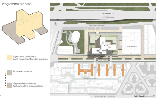 La transformation de l'hôpital Bichat est une proposition destinée au changement de programmation du bâtiment en bureaux pour la partie socle et en logement pour la partie tour. À l'échelle urbaine, le projet a pour but de créer une transition entre Paris et sa banlieue en transmettant la trame urbaine dans la partie socle de Claude Bernard.