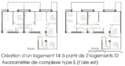 L'organisation spatiale à l'intérieur de la tour Bichat est constituée de deux types de logements: type M(logement mixité) et type E(logement étudiant). La conception de logements type M vient de la volonté de mixité typologique et offre aux nouveaux résidents la possibilité de réorganiser les espaces en fusionnant deux appartements indépendants en une seule unité plus grande (soit verticalement soit horizontalement). La diversité dans le type d'appartements: T2, T3, T4, T4 duplex-haut, T5, T6+ permet que les différents parcours familiaux soient possibles. L'aménagement de complexe type E consiste à diviser l'espace en deux parties principales: espace de chambre individuelle et espace commun où se trouve la salle à manger, la cuisine commune, la salle de lecture et la zone de divertissement.