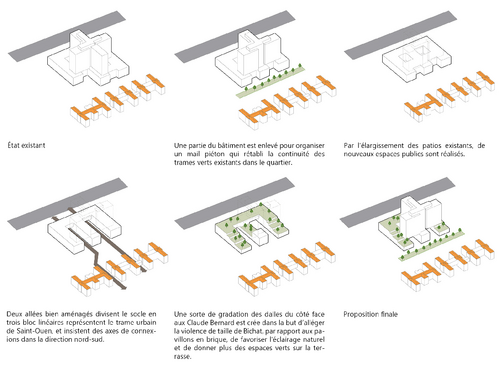 Les stratégies urbaines et architecturales consistent à enlever une partie du bâtiment afin d'organiser un mail piéton qui rétablit la continuité des trames vertes existant dans le quartier. Par l'élargissement des patios existants, de nouveaux espaces sont faits et deviennent des boulevards piétons bien aménagés et en même temps ils divisent le socle en trois bloc linéaires, représentant la trame urbaine de Saint-Ouen, et insistant sur les axes de connexions Nord-Sud. Une sorte de gradation des dalles du côté face Claude Bernard est réalisée en vue d'alléger la violence de la taille de l'hôpital Bichat par rapport aux pavillons en brique, de favoriser l'éclairage naturel et de donner plus des espaces verts sur la terrasse.