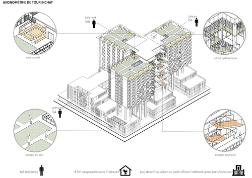 Dans la 2ème phase, les trois grandes ailes de l'hôpital Bichat sont orientées pour un projet de transformation en un logement collectif de 10 étages avec un potager et les zones pour se réunir sur le toit. Au sein de la tour, ce projet propose de mettre en place des serres hydroponiques pour une zone de production de légumes. Le but est de proposer des logements de différents types à 468 nouveaux occupants, et de fournir 8.7 m2 de serre à chaque personne pour cultiver à volonté.
