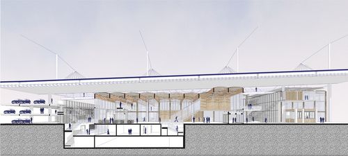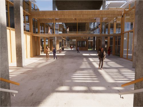 Perspective de l'atrium depuis le point bas de l'accès piéton depuis le continent
