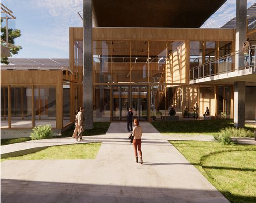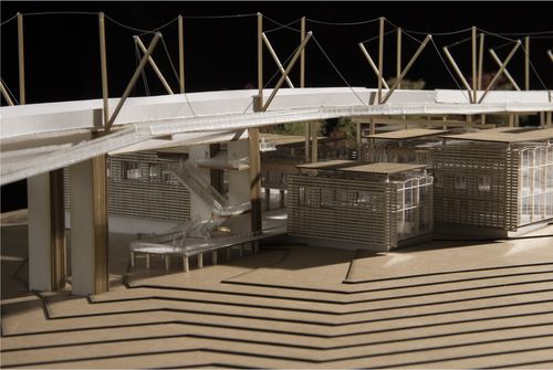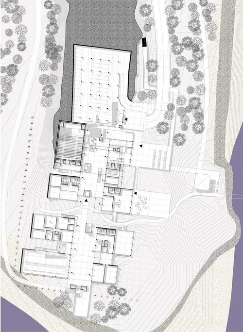 Le plan du projet est conçu autour d'une rue centrale, parallèle à la route départementale au-dessus, qui forme une colonne vertébrale. De chaque côté, des volumes s'organisent en peigne afin de chercher les vues et créer des axes transversaux. Un axe transversal majeur coupe l'axe longitudinal et créé une centralité, il sépare ainsi le pôle recherche du pôle, au sud, sensibilisation plus au nord.