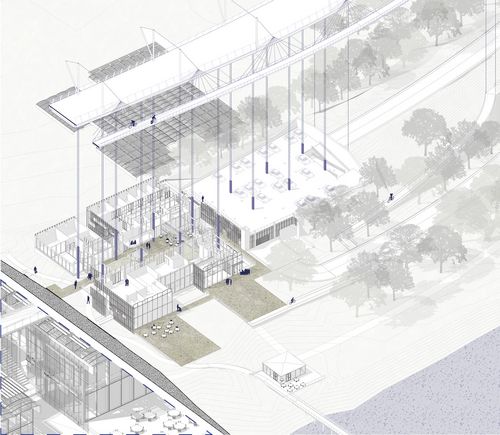 Le programme s'organise autour de trois axes : lier, rechercher et sensibiliser. Pour remplir ces objectifs le projet comptera : une passerelle piéton et une cycliste (de chaque côtés du pont), un pôle recherche (composé de bureaux, de salles de cluster et d'une salle d'expérimentations à grande échelle) et un pôle sensibilisation (composé d'un auditorium, de salles d'exposition et d'ateliers pédagogiques).