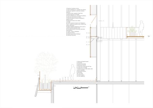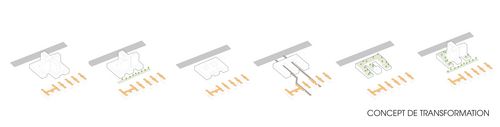 Une stratégie urbaine est proposée pour établir une connexion plus harmonieuse par rapport aux pavillons Claude Bernard : une partie du bâtiment est enlevée pour organiser un mail piéton qui rétablit la continuité des trames vertes existantes dans le quartier. Ensuite, j'ai choisi une tranche de la partie Socle pour la transformer en bureaux, avec un travail sur une nouvelle façade qui répond aux exigences de consommation d'énergie et en même temps à un respect, un écho envers l'histoire de la construction du bâtiment tout en donnant un souffle contemporain à travers le traitement architectural.