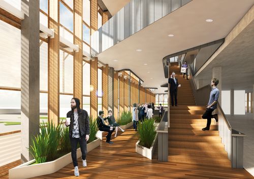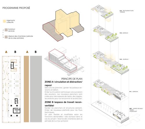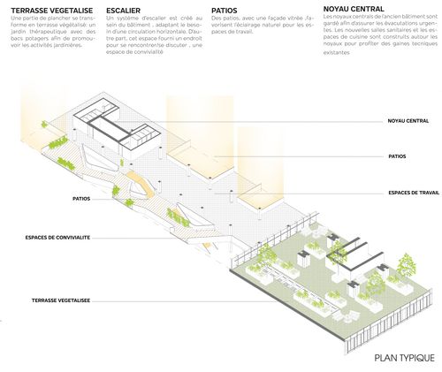 L'aménagement intérieur privilège la réutilisation des structures existantes en béton, des noyaux centraux et propose de nouveaux espaces végétalisés qui aident à alléger les anxiétés, le stress, les crises psychologiques pour les employés et même pour les patients dans le cas d'une réquisition de ce bâtiment comme réserve hospitalière.