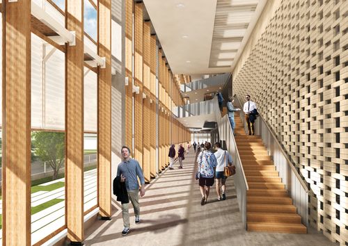 Vue à l’intérieur. Le hall d’acceuil du projet où on aperçoit le systèmes pare-soleil supportés par les poteaux en bois. Chaque bout du poteau est relié en bas aux dalles béton,en haut aux poutres béton par des fixations métalliques
