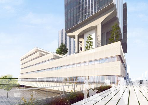 Vue à l’extérieure du projet. Le partie Socle avec un travail de nouveau façade : des bandeaux des panneaux translucides. L’idée est de donner la légèreté du nouveau bâtiment venant de la transparence de la façade marque un contraste avec la grandiosité