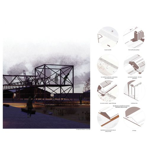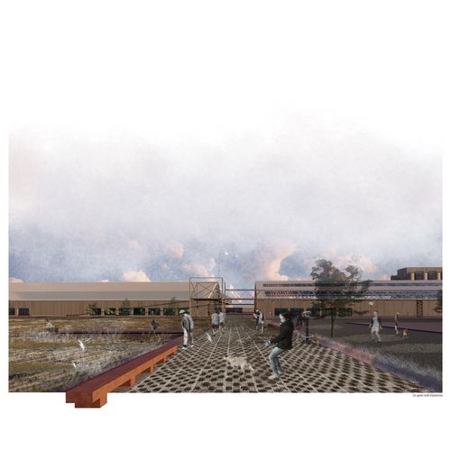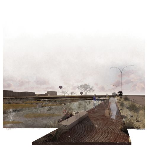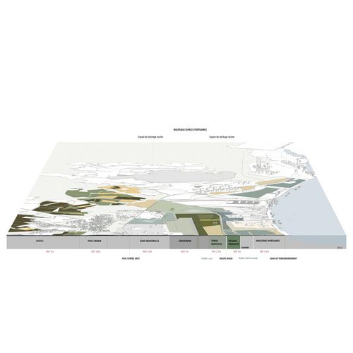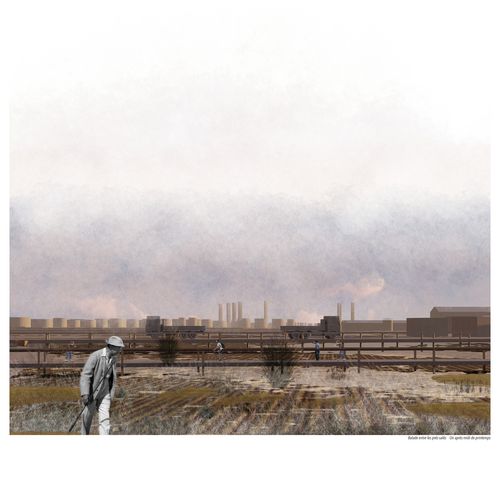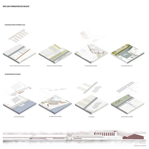 L'objectif étant d'établir un maillage de relations, le projet propose de chevaucher les stratégies. L'enjeu était de proposer une approche d'adaptation globale sur le temps long, qui témoigne d'une nouvelle cohabitation entre les milieux artificiels, et les futurs milieux naturels. L'objectif premier de ce PFE était d'envisager un projet dans sa globalité, et effacer les frontières entre le paysage, les usages et le sujet architectural, afin "d'entrer en conversation avec le territoire".