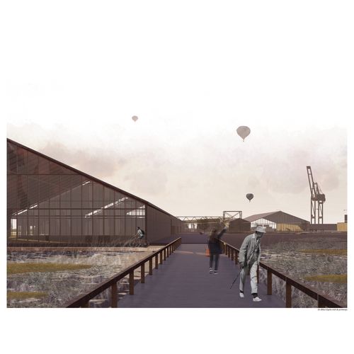 En ces temps de crise sanitaire, de catastrophes climatiques, d'insécurité alimentaire ou encore d'appauvrissement des écosystèmes, nos vies et nos villes sont en pleine mutation et génèrent de nombreuses réflexions quant aux nouveaux modèles qui pourraient émerger. À l'ensemble de ces problématiques s'ajoute celle de la montée des eaux, qui constitue un enjeu majeur pour le devenir des territoires littoraux, notamment le territoire atlantique. Aujourd'hui, sur les rives de l'estuaire de la Loire, un paysage de l'après-pétrole se met peu à peu en place, cependant, cette transition vers la sobriété carbone semble relativement lente. L'embouchure fait face à un défi pour contrôler sa croissance en fonction de l'évolution des conditions dans l'industrie, l'économie et le mode de vie. Ce projet a pour objectif de confronter le paysage de l'embouchure à une vision prospective, afin de mettre en avant l'urgence écologique à laquelle nous faisons face. Bien qu'il soit primordial de trouver des solutions techniques ou programmatiques face à cette montée des eaux, n'est-il pas le moment de questionner un système global et libérer nos imaginaires ?